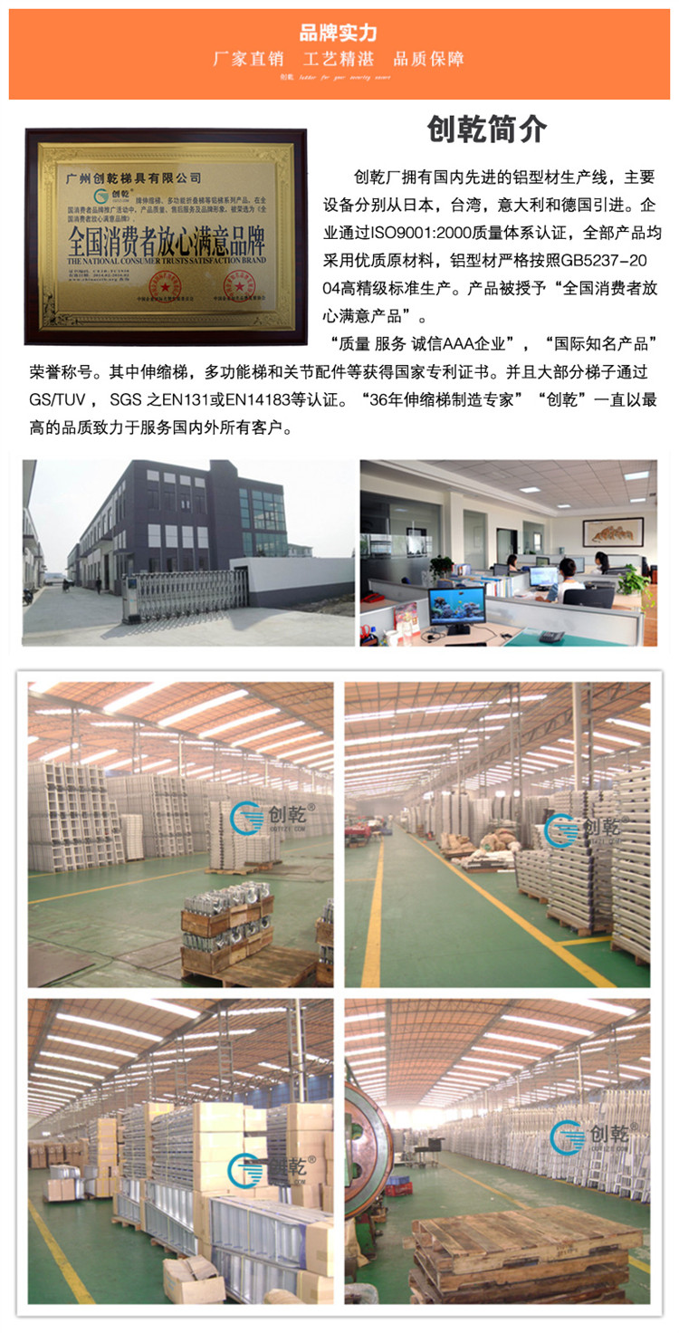 大連華峰白鋼鋁業(yè)有限公司吳先生深夜咨詢,只為選擇創(chuàng)乾便攜式登高人字梯。便攜式登高人字梯在市面上有很多款類似的產(chǎn)品,當然不能說創(chuàng)乾家的就是最好,但創(chuàng)乾梯子的的確確是實打?qū)嵉淖龉?/span>。創(chuàng)乾便攜式登高人字梯采用6061T6鋁型材,外形美觀,攜帶方便,操作簡單,伸縮自如,占用空間小??扇我庹{(diào)節(jié)使用高度,承重高達150KG。通過SGS EN131認證并獲國家專利證書。用心制作,讓客戶放心的工程梯子,是我們創(chuàng)乾人的行事準則之一。